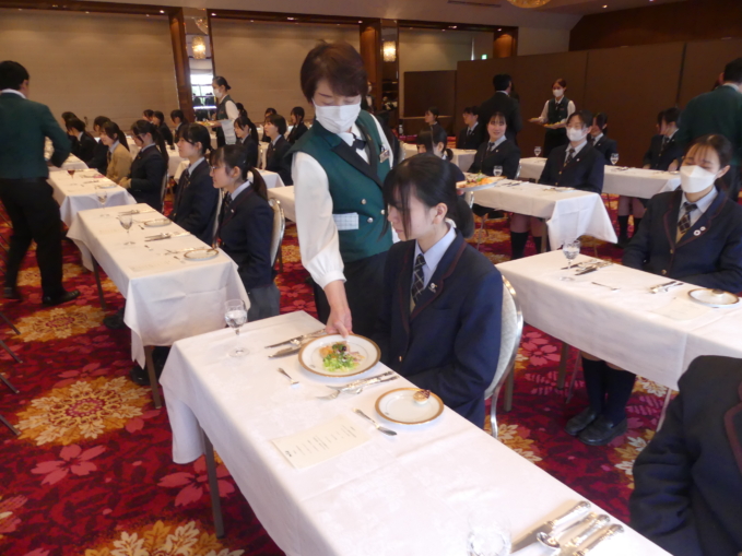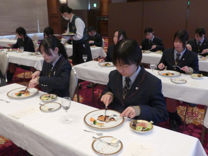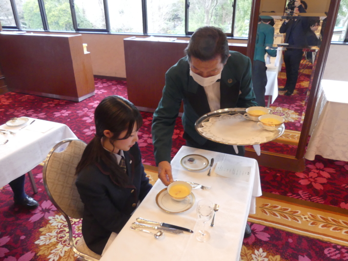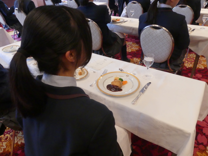 1月28日(水)、高校3年生を対象としたテーブルマナー講習会が行われました。上野に集合した生徒は、まず国立科学博物館を見学し、その後精養軒へ向かいました。講師である田島 史雄様(本店 グリルフクシマ マネージャー)より、西洋料理のフルコースを頂きながらカトラリーを扱う方法や料理の頂き方など、映像を交えながら食事のマナーやエチケットについてご説明頂きました。格式高い精養軒の雰囲気に緊張しながらも、教えて頂いたことを目の前の美味しいお食事でしっかりと実践しました。